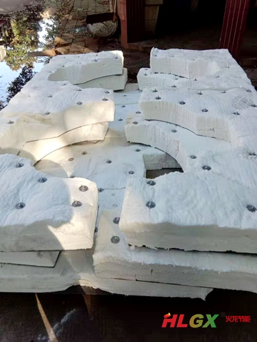 炉衬的安装工作可以在炉壳整体焊接后项目地现场施工,也可以在炉壳组装之前工业炉厂家车间施工。上图为炉壳组装前先将HLGX陶瓷纤维毯根据炉壳的形状裁切成型,层铺至所需厚度,用耐热不锈钢锚固件固定在炉壳上。